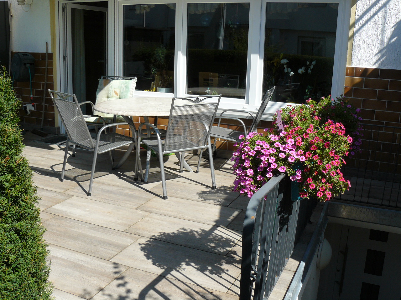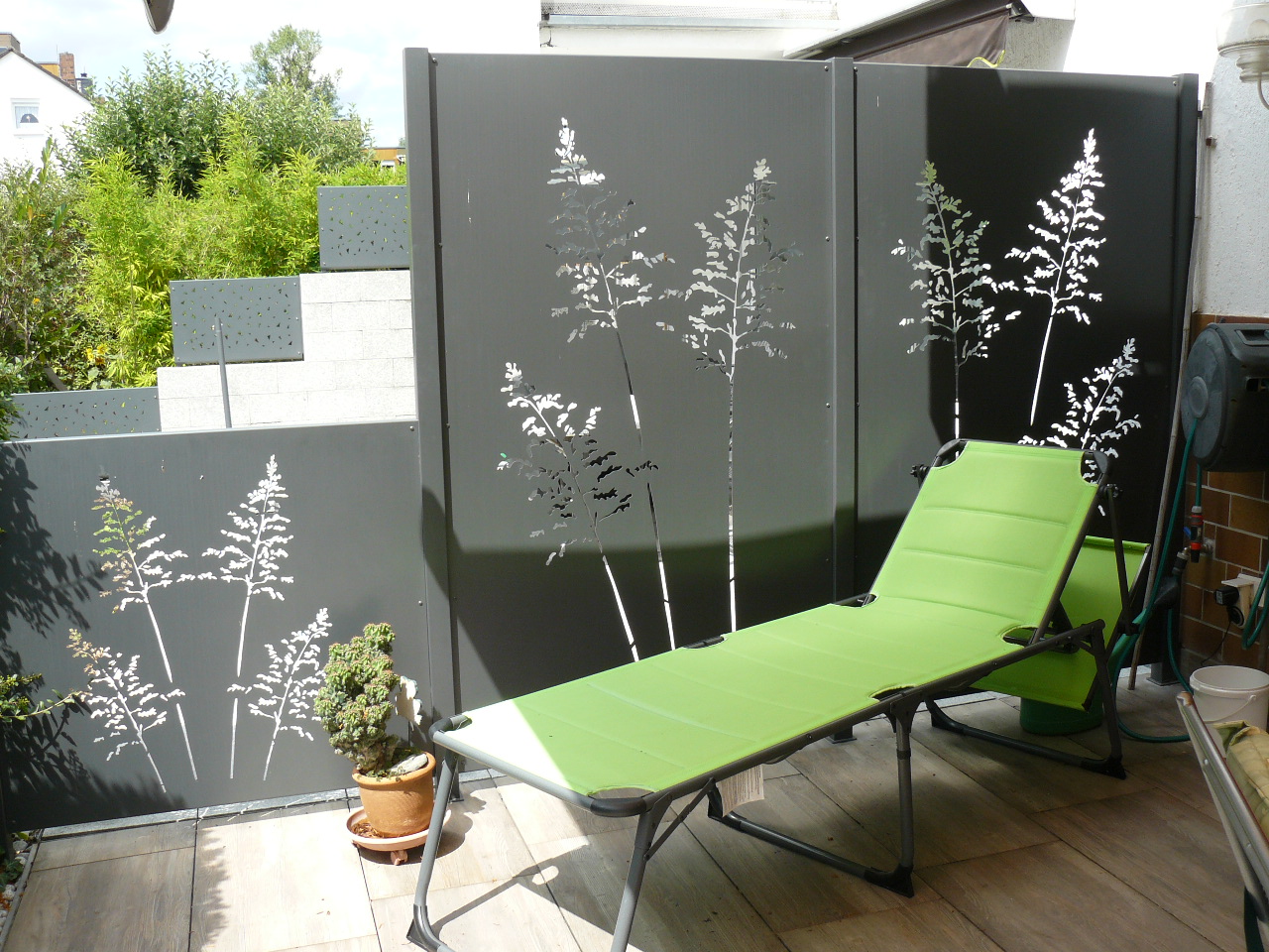 2016 Terrasse neu belegt und Sichtschutzblende aus Nirosta-Stahl neu errichtet.